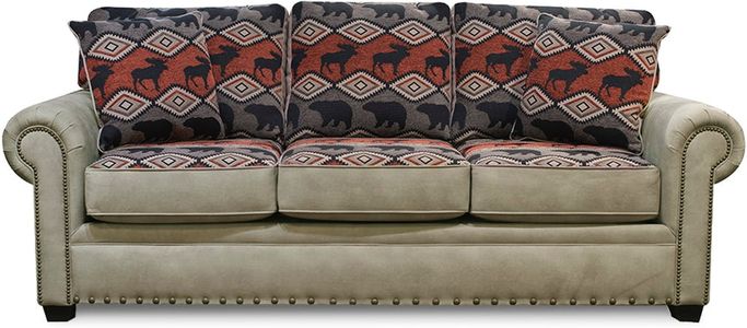 The lodge look is alive and well in our Jaden sofa. A three cushion style in married fabrics with pyramid legs and rolled and welted arms. Toss pillows are reversible. Novelty patterns combined with a leather-look-alike provide the perfect choice for your cabin or retreat home. Loveseat, chair and ottoman also available.Read More