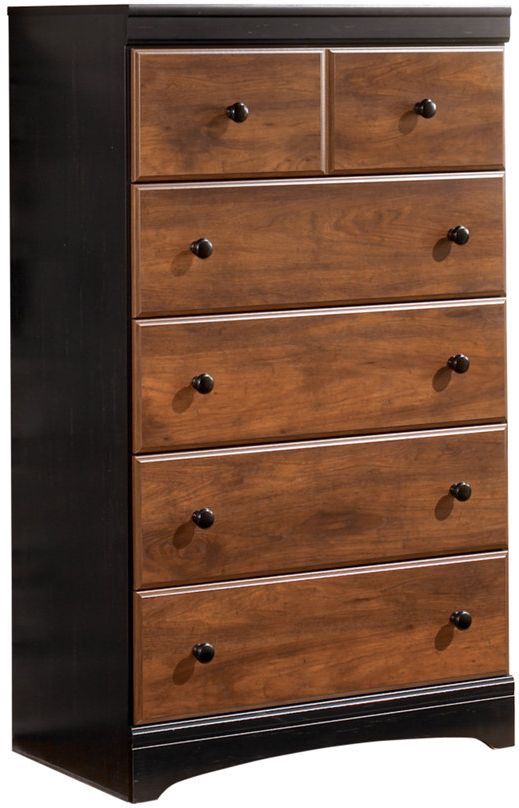 Tall with a slim profile, the Aimwell chest features 5 smooth-gliding drawers for ample storage room in a compact space.