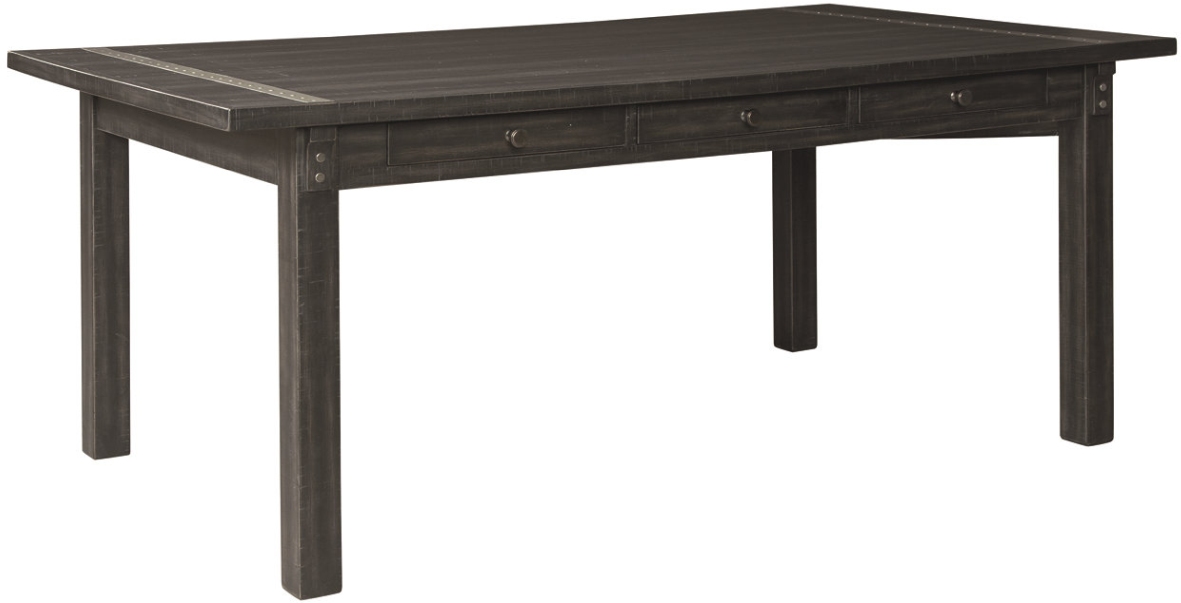 Dine in the farmhouse splendor and casual style of the Baylow six-drawer dining room table. Its spacious rectangular top sports a reclaimed look from the vintage black washed finish and saw kerf detailing. For a hint of industrial style, zinc-tone accents catch your eye with metal bands that dote each end of the table and decorative nailheads. Six convenient drawers make this table practical with room for keeping placemats, napkins and utensils—what a plus when it comes to setting the table.