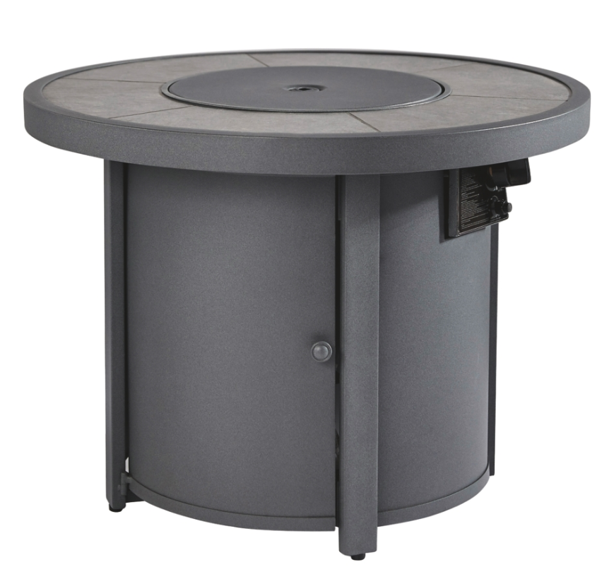 The dark gray, Donnalee Bay round fire pit table provides flame heating via a discreet propane tank compartment (not included), hidden by a door for a sleeker appearance. The rust-proof aluminum allows for ideal longevity no matter the climate, so you can enjoy more nights by the fire.