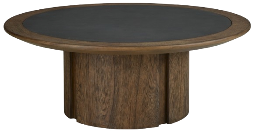Finished in a classic warm brown wood tone contrasted with a dark faux cement inset top