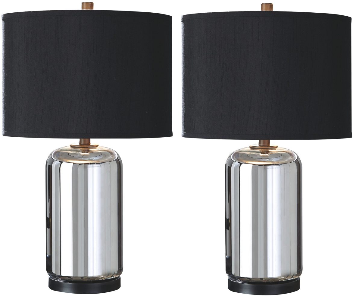 The Marinda table lamp set of 2 features reflective mercury glass bases with black, fabric drum shades.