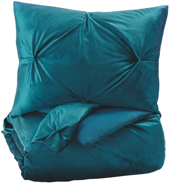 The Meilyr king comforter set in “spruce” blue-green is sure to spruce up your space with color and texture. Its velvet face fabric is all puckered up with a pintuck design. Cotton percale on the reverse adds contrast.