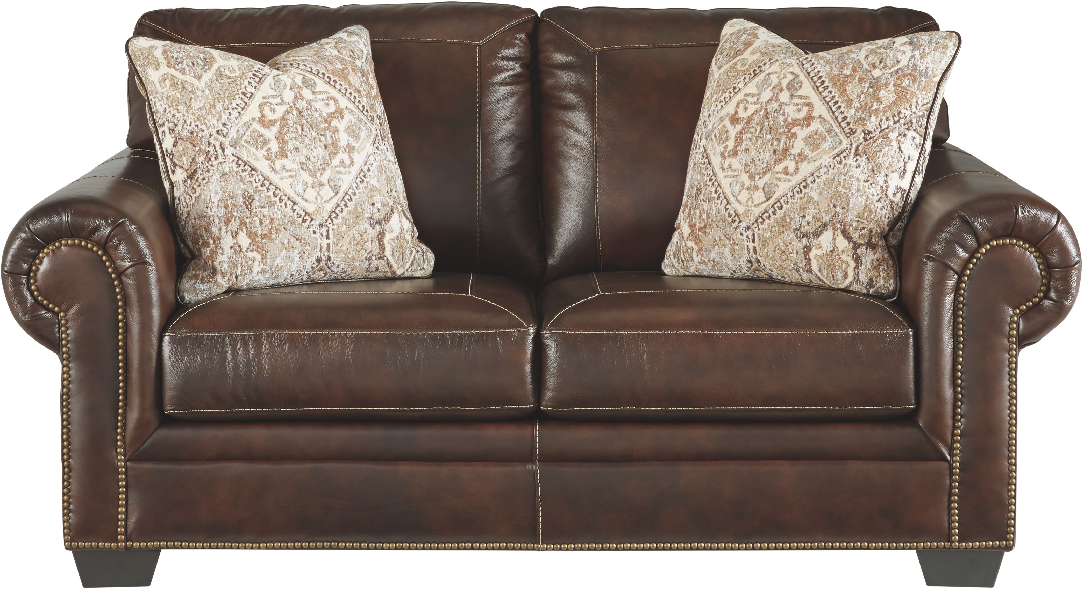 Luxurious leather is just one incentive to kick back and relax on the warm and traditional style of the Roleson collection. Add in sturdy platform foundation support, ample seating nestled between rolled arms, nailhead trim, and jumbo stitching, and this Signature Design by Ashley® series becomes a standout choice in your home.
