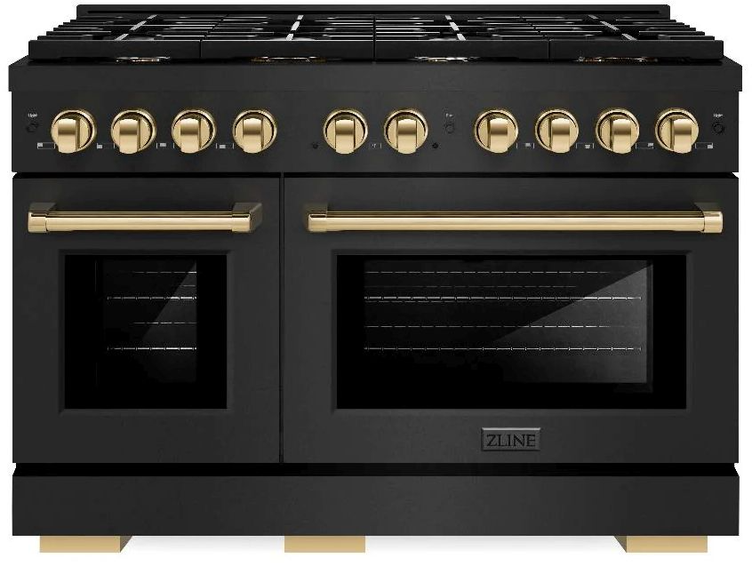 The ZLINE Autograph Edition 48 in. 6.7 cu. ft. Paramount Double Oven Dual Fuel Range with 8 Burner Gas Cooktop in Black Stainless Steel and Polished Gold Accents (SDRBZ-48-G) combines the versatility of a gas cooktop with 8 Italian-made auto-reignition burners, a large high-performing electric convection oven and a small bake-and-broil oven with digital thermostat technology, enhanced cast iron grates, Horizon oven door window designs, and polished gold knobs and handles allowing you to master every meal.